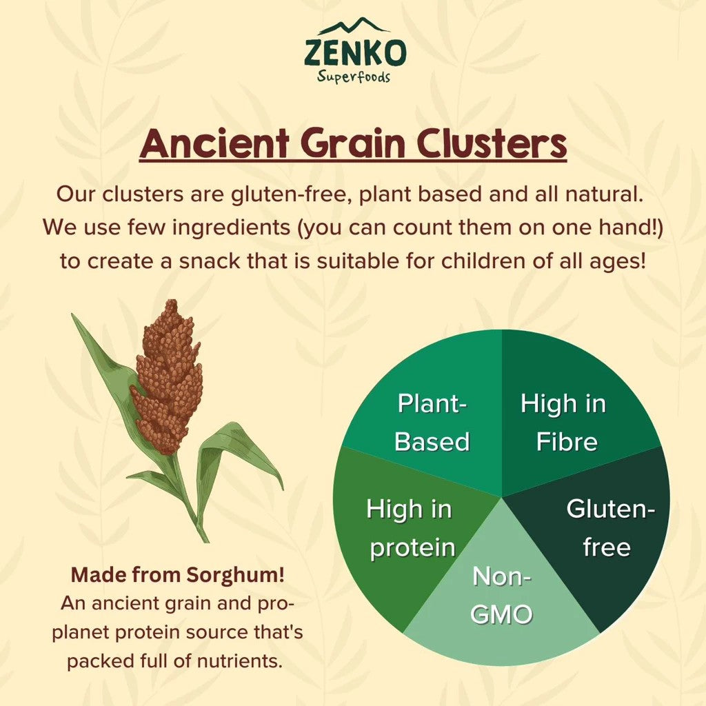 Ancient Grain Clusters is an ancient superfood grain called sorghum. Sorghum is one of the seven ancient grains that has been around for over thousands of years and has never been modified. In Maharashtra, these sorghum grains are naturally harvested, sun-dried, roasted then popped to produce a sweet, crunchy and tasty breakfast snack.